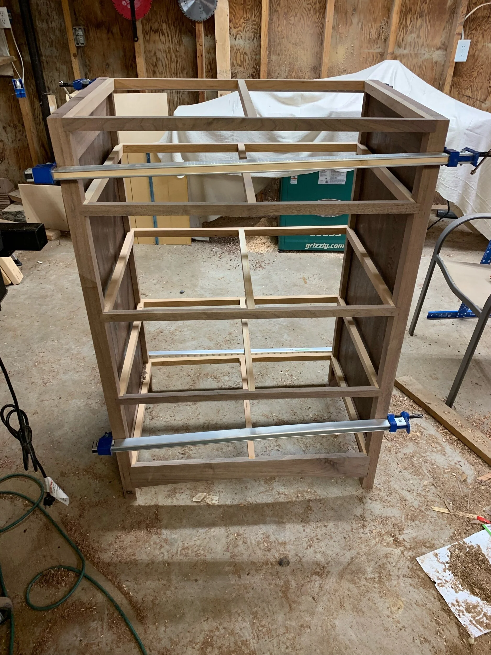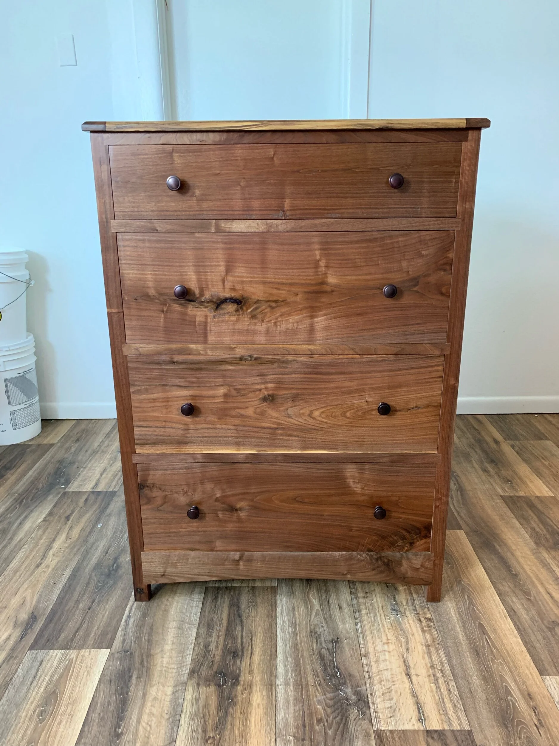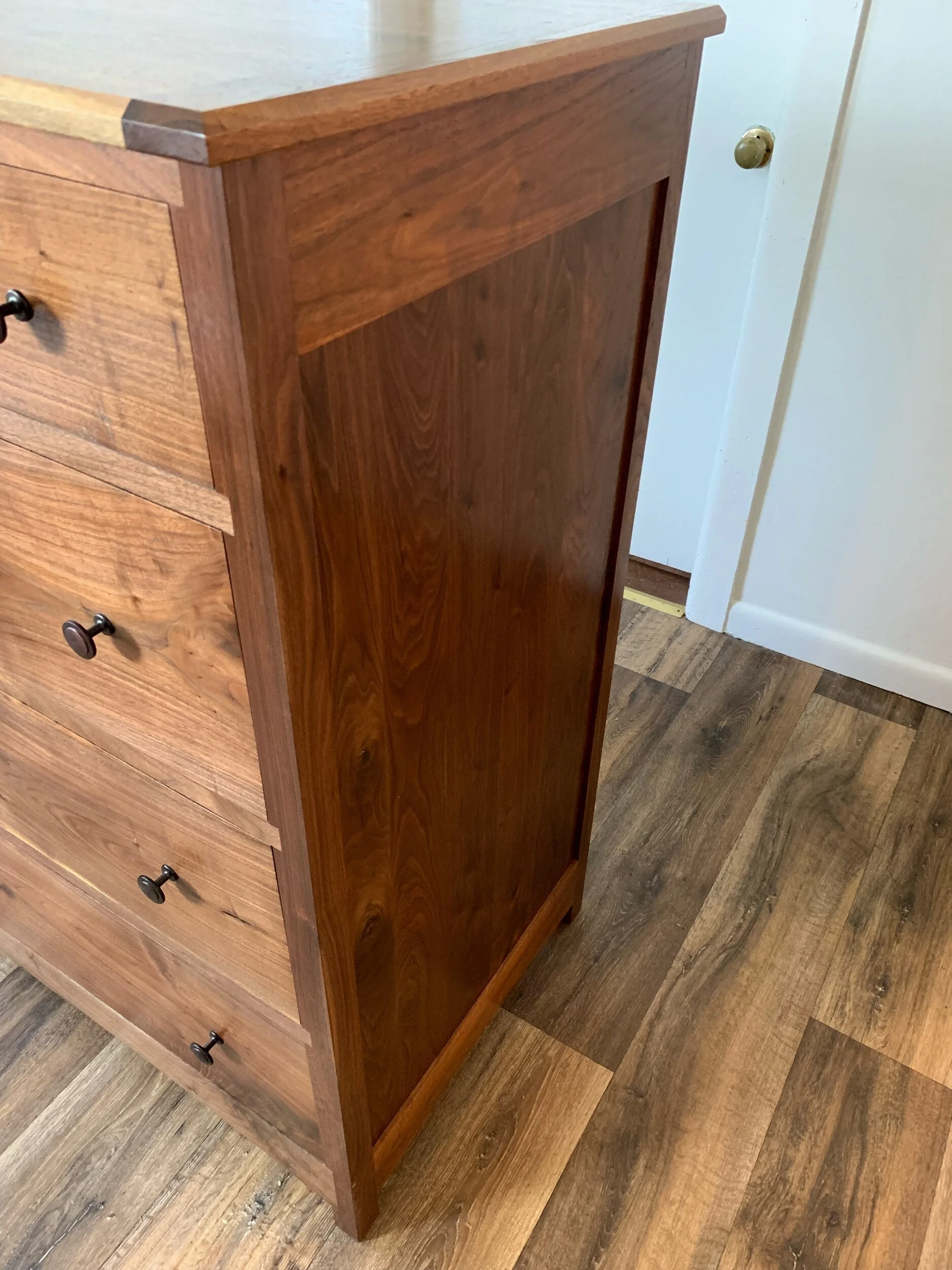 This chest of drawers is another piece of the bedroom set that I am building for my wife and I. It is constructed using walnut as the primary wood and cherry as the secondary wood. The sides are solid walnut panels floating in a walnut frame. I made the top with breadboard ends to minimize the effect of the end grain. The drawers were constructed out of 1/2” plywood using rabbets and glue for support. They also have a floating bottom panel which is made from 1/4” plywood. I rounded it off by using soft close drawer slides for a luxurious feel. I really wanted the soft close slides since we will be using this every single day. On the bottom stretchers I added a soft curve. The entire dresser was finished in my own homemade version of wipe on poly. All in all, I am very pleased with how this simple dresser came together. It is a nice addition to the bedroom set!